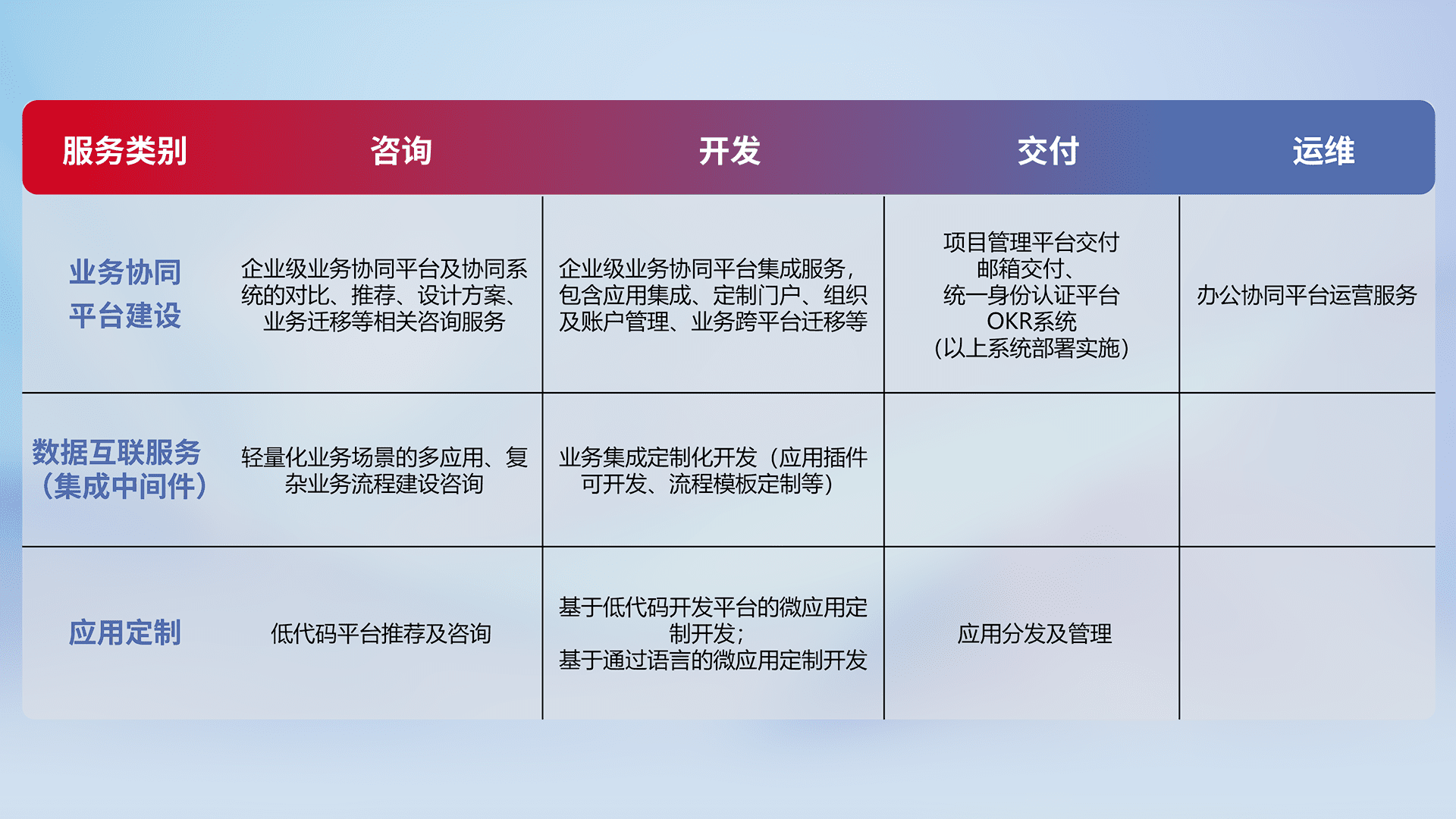 针对钉钉、、、企微、、、IDaas等平台级产品提供产品的规划、、方案、、交付、、定制化开发等服务,,,实现如统一协同办公、、智能客户服务、、、、混合会议管理、、、、智能数据查询、、等业务场景,,,实现数字化转型。。。