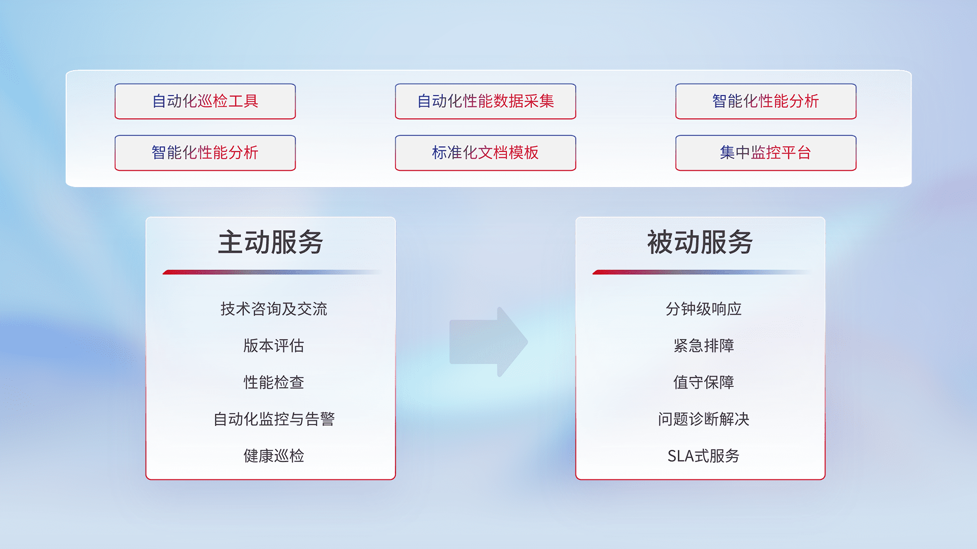智能化工具和标准化文档,,保障服务质量,,,,提供主动服务(包含技术咨询、、、、版本评估、、、、性能检查、、自动化监控与告警、、健康巡检)和被动服务包含(分钟级响应、、、、紧急排障、、值守保障、、、问题诊断解决、、、SLA服务)。。。